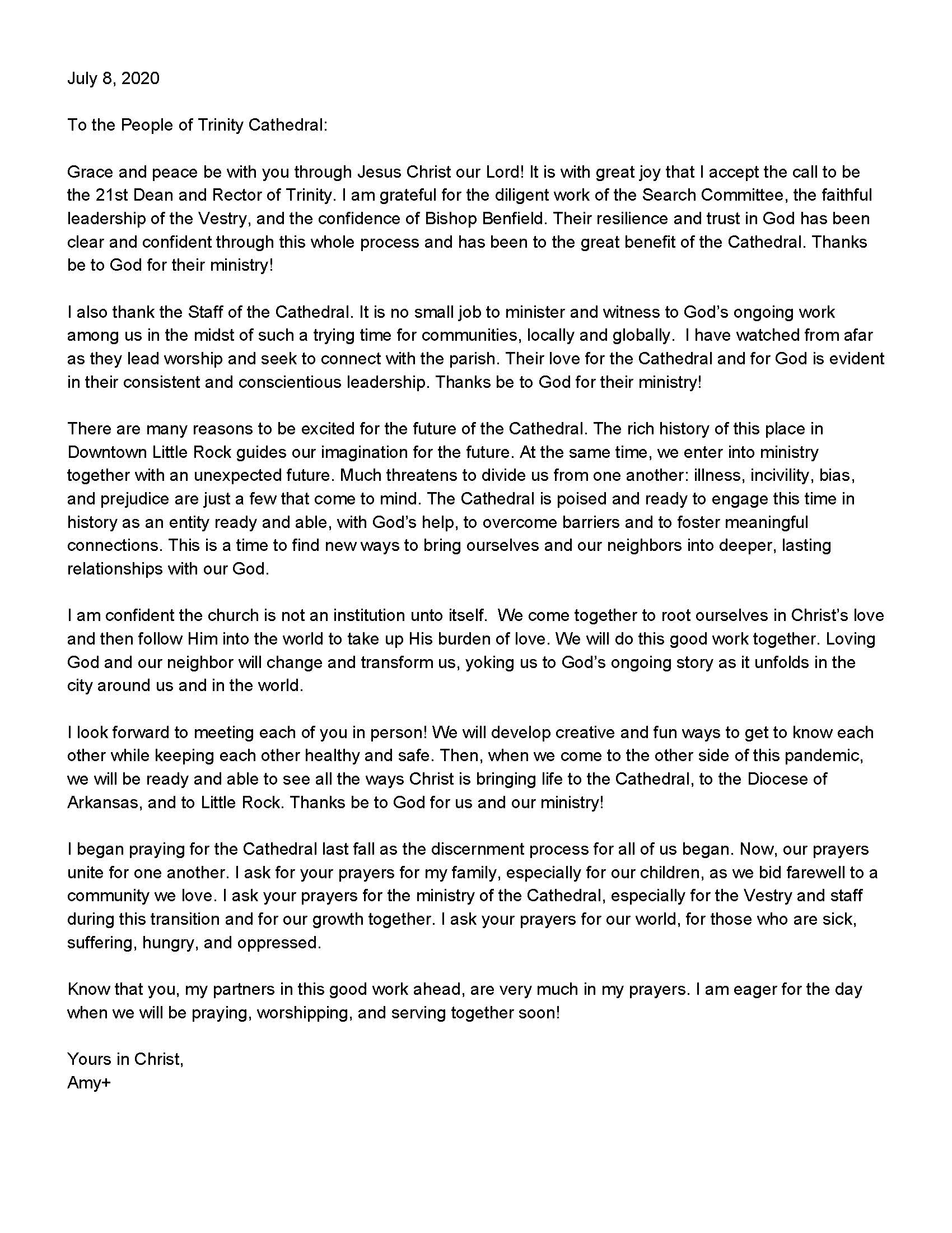 Grace and peace be with you through Jesus Christ our Lord! It is with great joy that I accept the call to be the 21st Dean and Rector of Trinity. I am grateful for the diligent work of the Search Committee, the faithful leadership of the Vestry, and the confidence of Bishop Benfield. Their resilience and trust in God has been clear and confident through this whole process and has been to the great benefit of the Cathedral. Thanks be to God for their ministry! read more